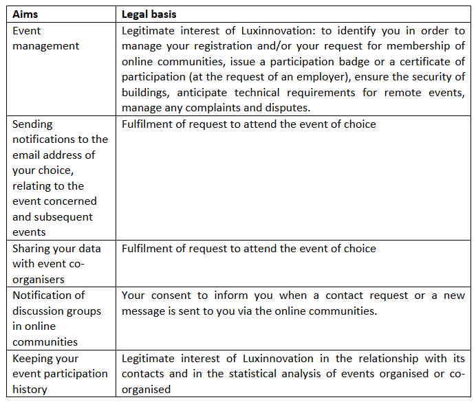 The Luxinnovation database: the personal data collected during your event registration is stored in Luxinnovation's database. It is deleted within 36 months of the date of last contact, unless you exercise your right to erasure (see below: What are your rights and how can you exercise them?
